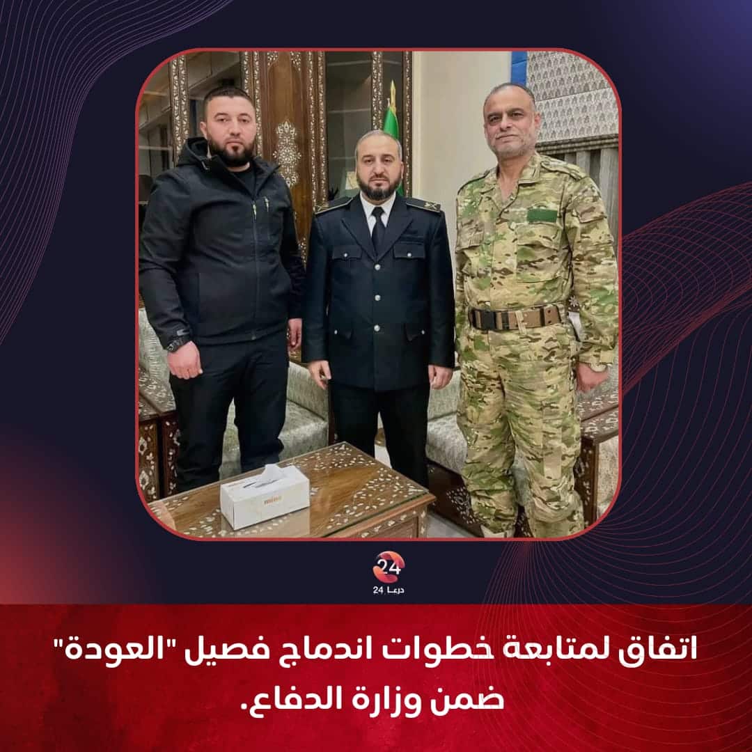 عُقد اجتماع في العاصمة دمشق جمع قادة من الفصيل الذي يقوده “أحمد العودة”، وهما “نسيم أبو عرة” و”علي الصباح” الملقب بـ”علي باش”، مع وزير الدفاع السوري “مرهف أبو قصرة”. وفقاً لمصدر من الفصيل لموقع درعا 24، سيتم عقد اجتماعات أخرى مع مسؤولين في وزارة الدفاع لمتابعة المناقشات.