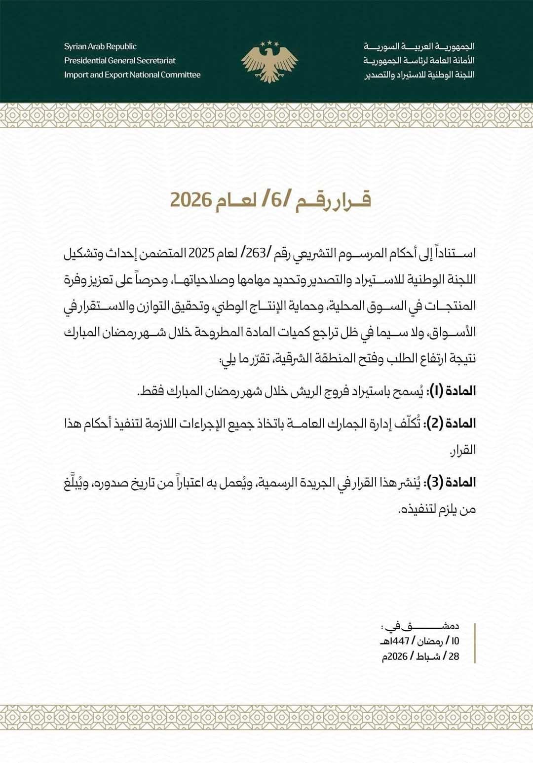 وبموجب القرار رقم /8/ لعام 2026، تم تمديد العمل بالقرار رقم /6/ لعام 2026، الذي يسمح باستيراد فروج الريش، وذلك حتى تاريخ 30 نيسان 2026. كما نص القرار رقم /7/ لعام 2026 على تمديد العمل بالقرار رقم /5/ لعام 2026، الخاص بالسماح باستيراد بيض الفقس وصوص التربية، حتى التاريخ ذاته.